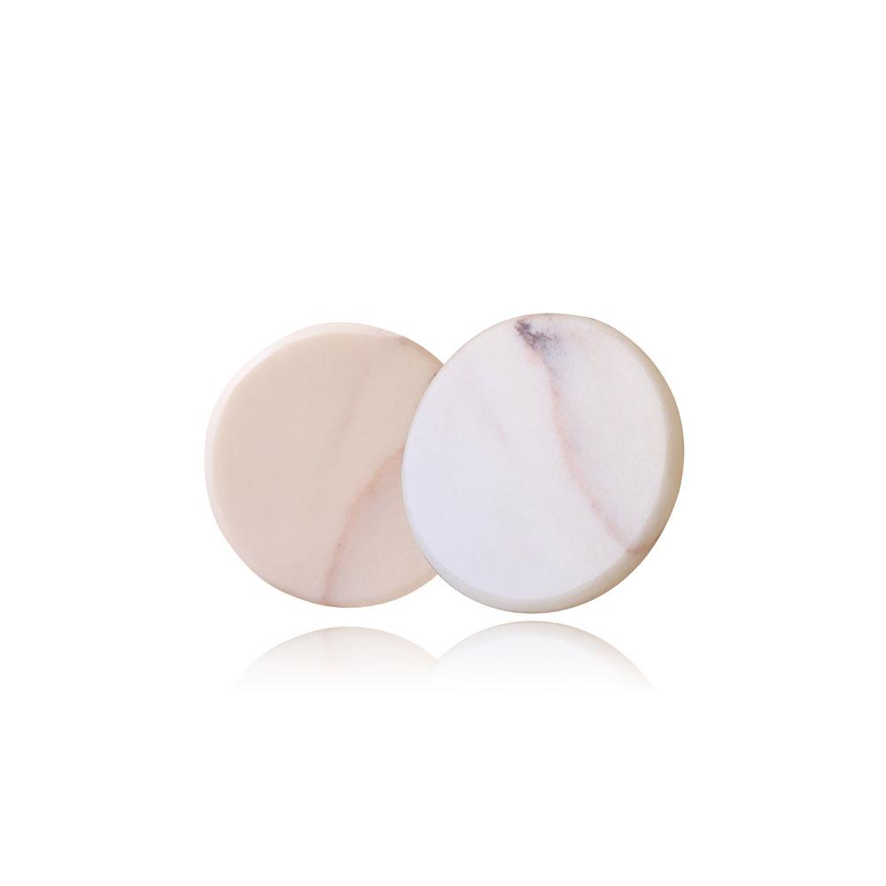 • Duas bases redondas de mármore em tons bege e branco com veios naturais