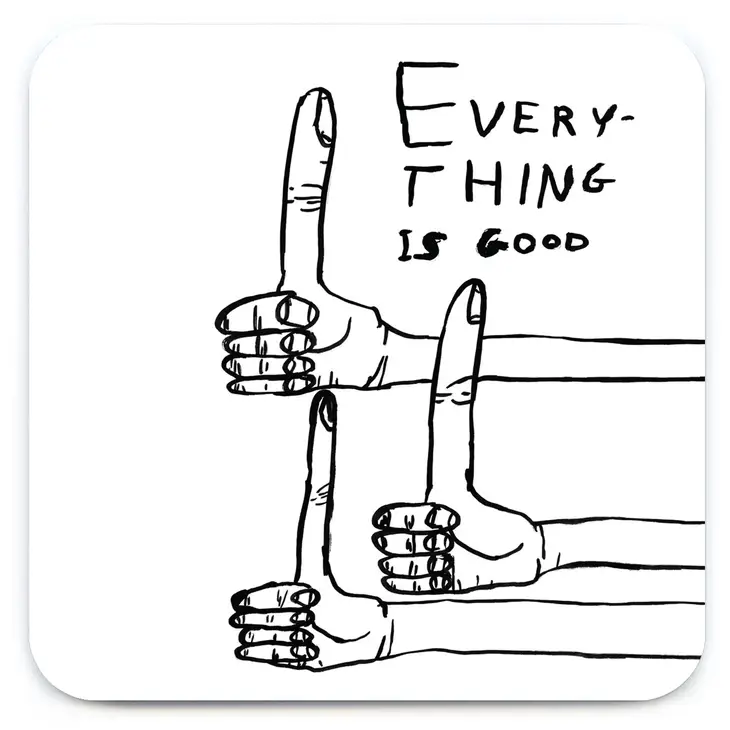 Desenho a preto e branco de três mãos a fazer sinal positivo com texto 'EVERYTHING IS GOOD' ao lado