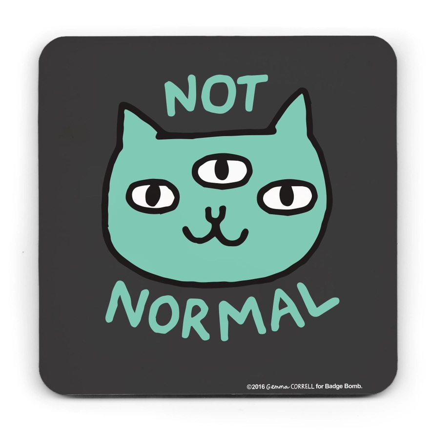Quadrado preto com ilustração de gato de três olhos e texto NOT NORMAL