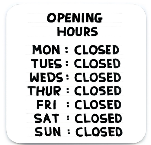 • Placa branca com texto preto com horário de funcionamento fechado todos os dias