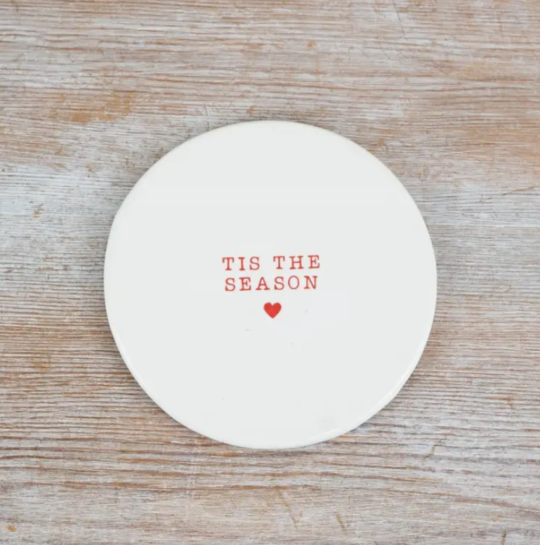 Base simples em cerâmica com a frase festiva "Tis the Season" com letra em vermelho e um pequeno coração.
