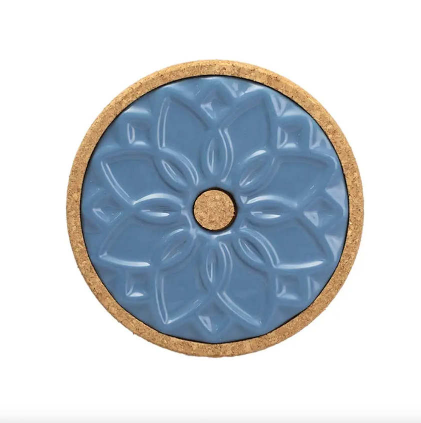 • Suporte redondo para copos azul com base de cortiça e padrão floral