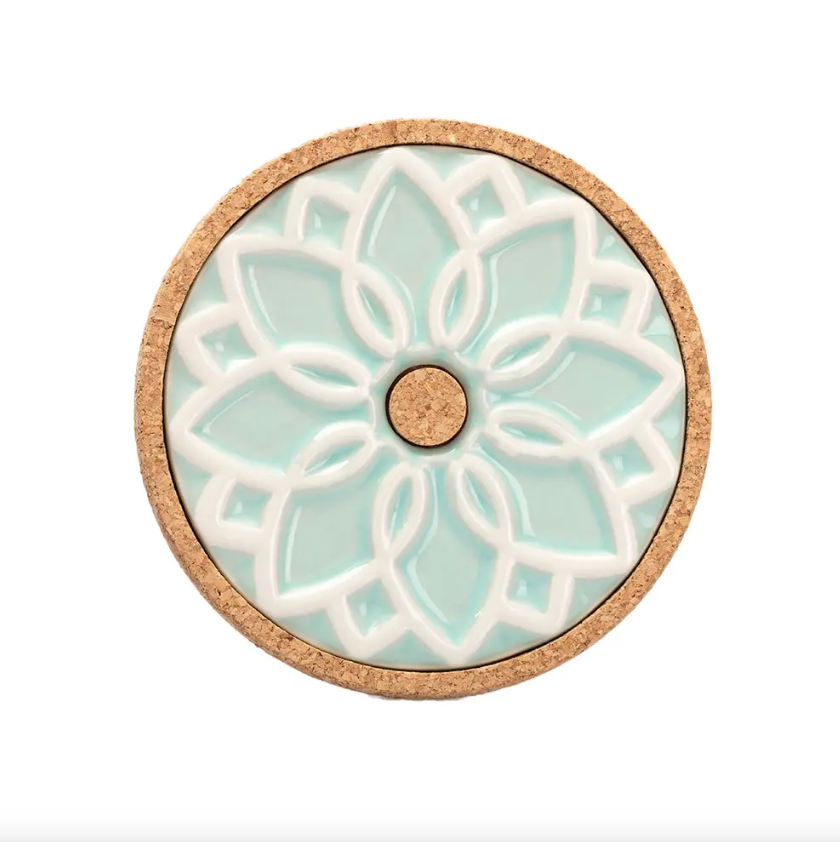 • Base redonda decorativa em cerâmica e cortiça com padrão floral