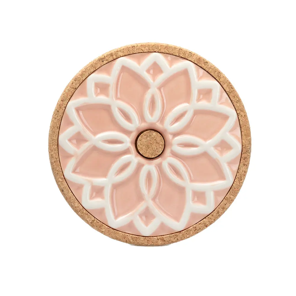• Suporte redondo em cortiça com decoração de mandala rosa e branco