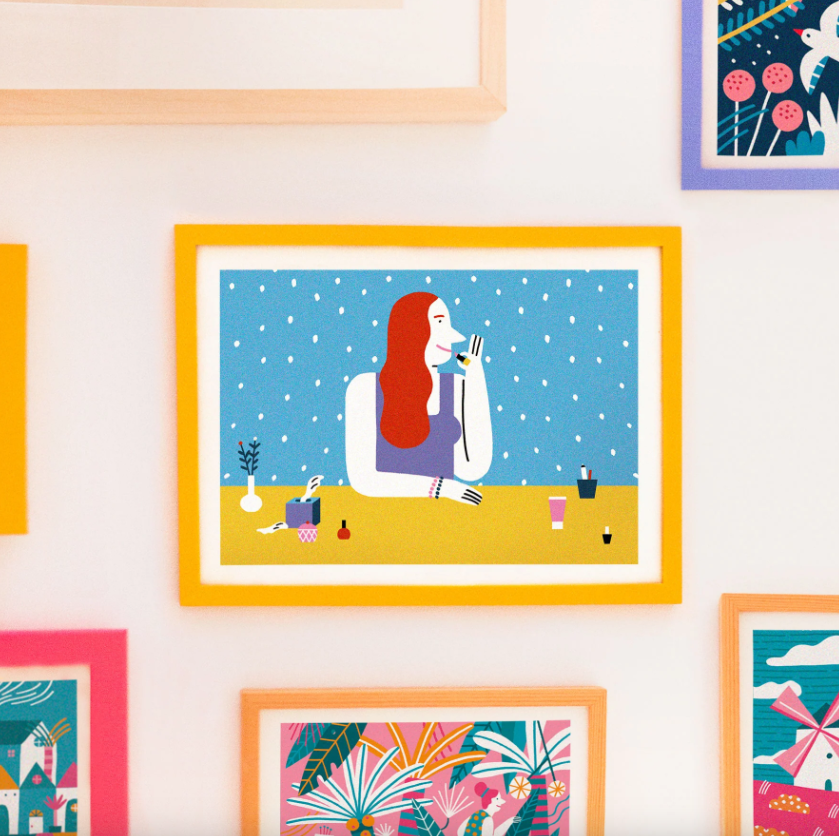 • Ilustração colorida de mulher ruiva num quadro com moldura amarela na parede