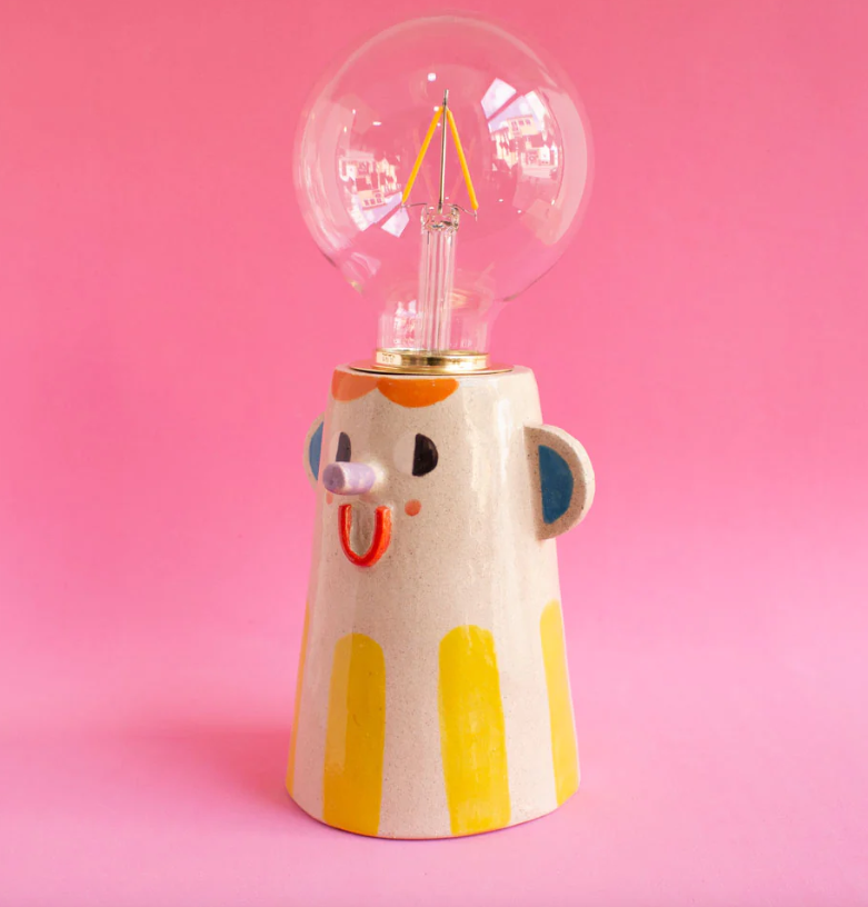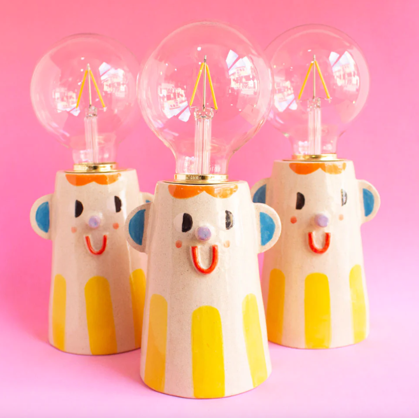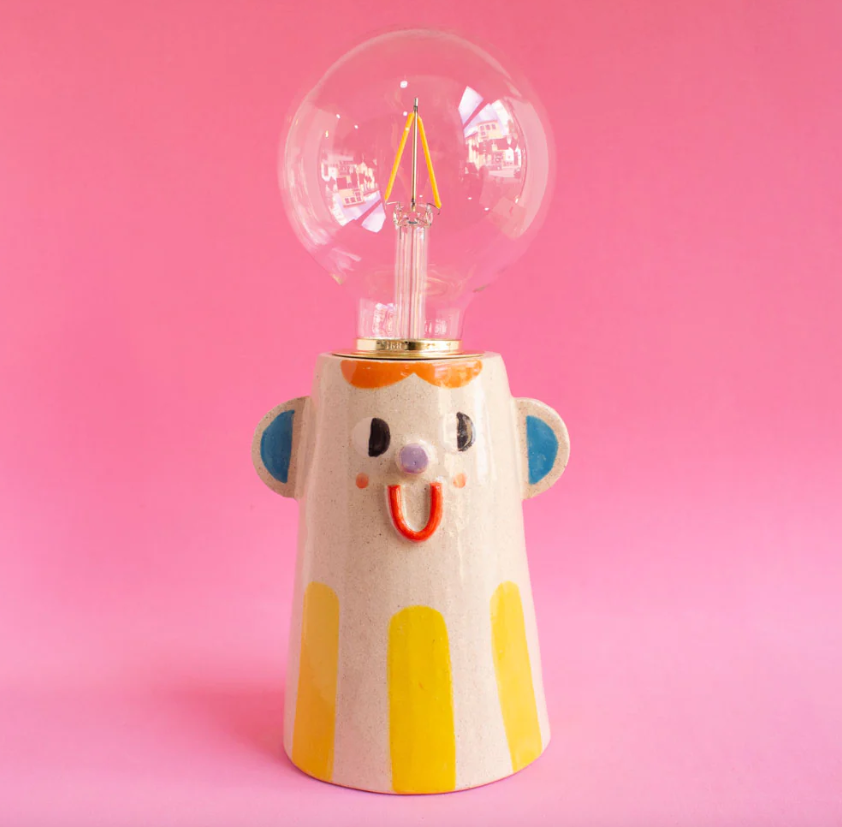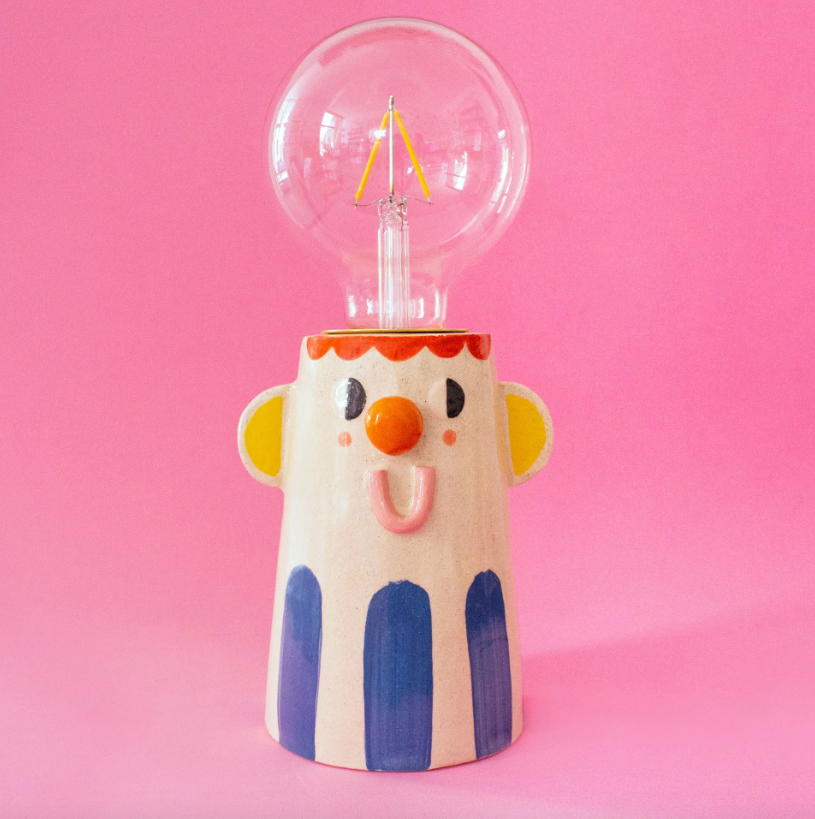 • Lâmpada com base em cerâmica pintada com rosto cartoon em fundo rosa
