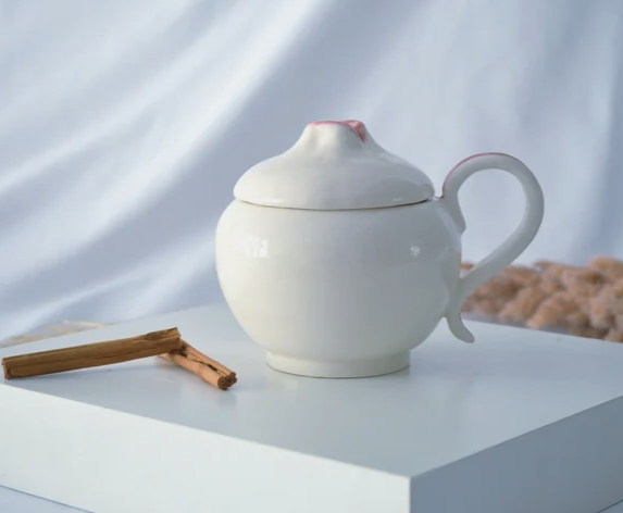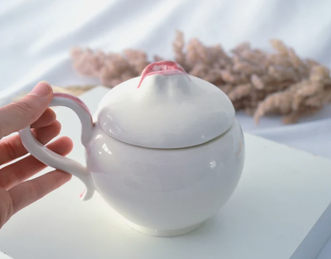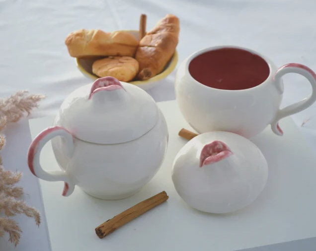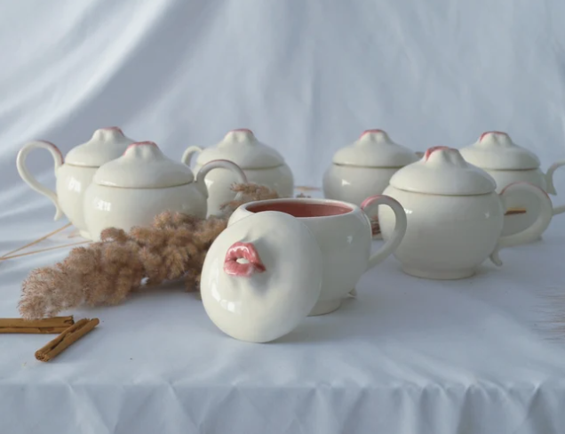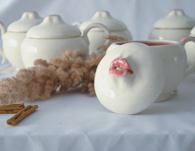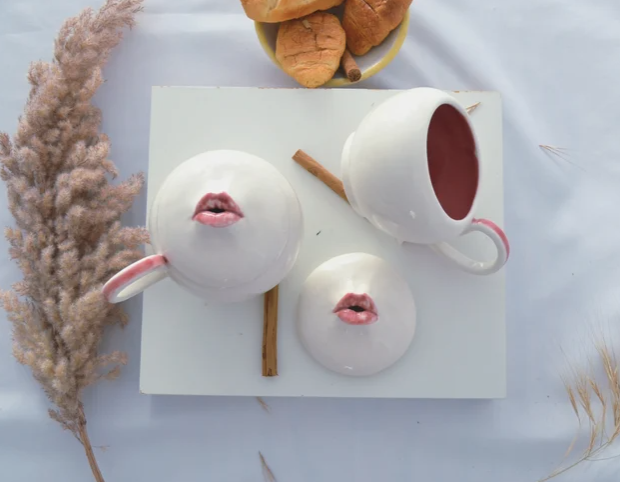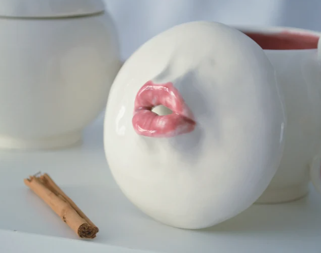Large ceramic mug with lid. It is a large mug with a capacity of about 400 ml, ideal for preparing a good cup of coffee or tea or even soup. Because of the lid, your drinks will stay warmer for longer. It has a very personal design and is very inspired by my most artistic pieces. It belongs to the Kiss Mug collection, in which mouth motifs appear, in this case the mouth is slightly open so that the steam slowly escapes through the lips.
