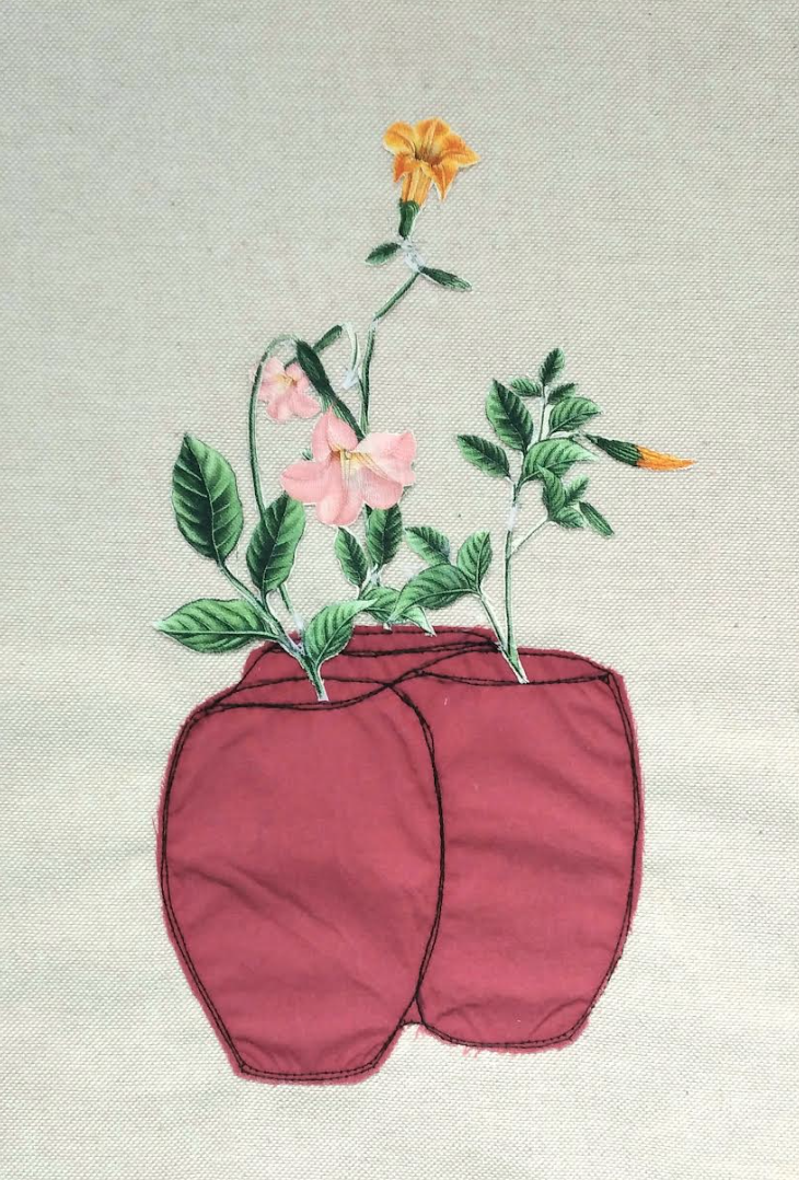 • Bordado de vasos cor de vinho com plantas de folhas verdes e flores laranja e rosa sobre tecido cru