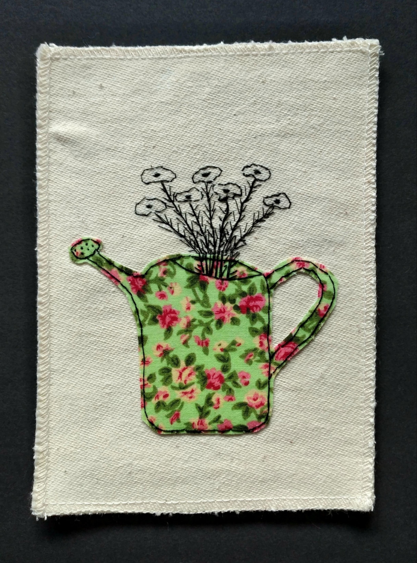 Bordado à mão sobre pano cru com aplicação de tecido 14,5 x 10,5 cm (vertical)
