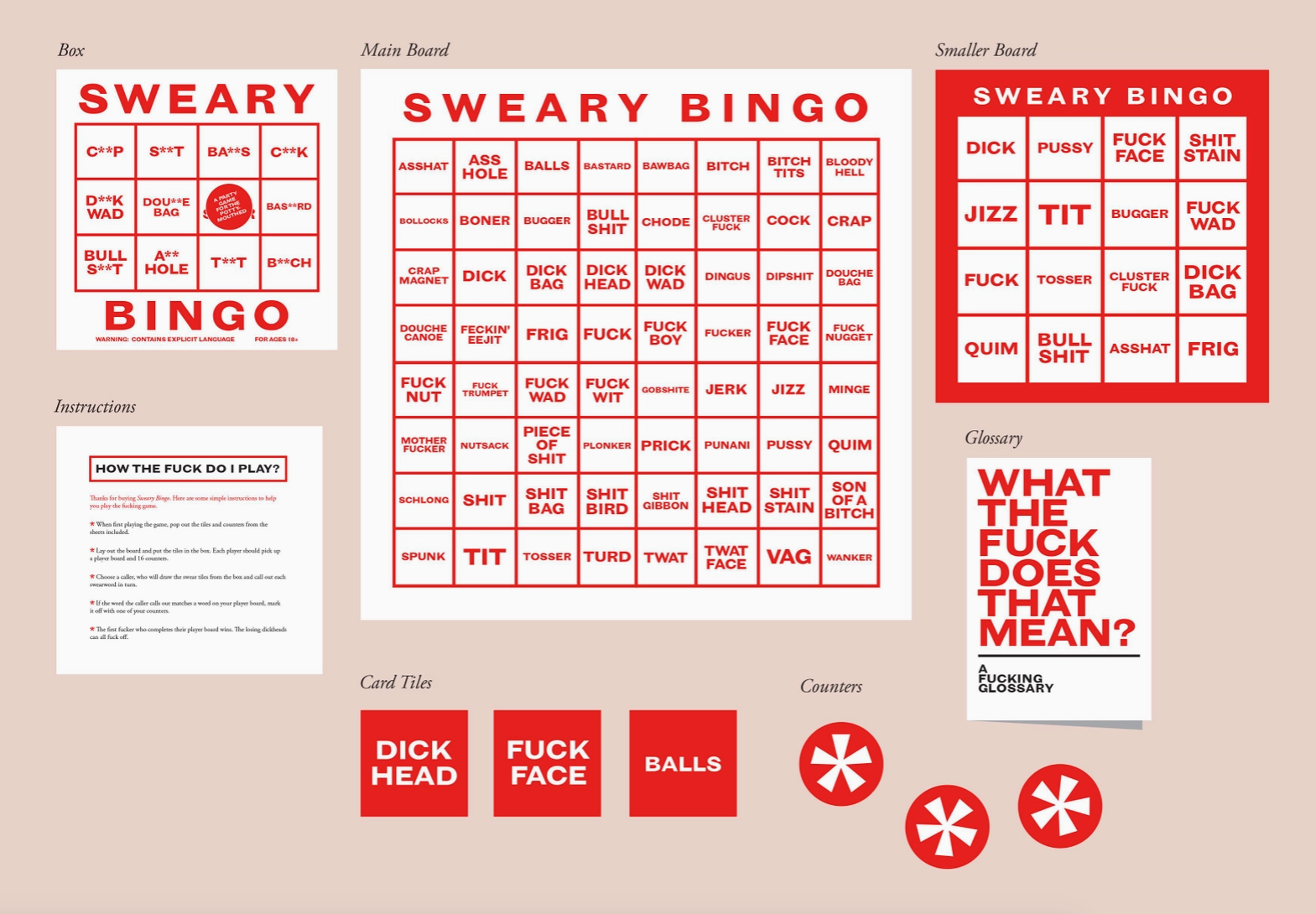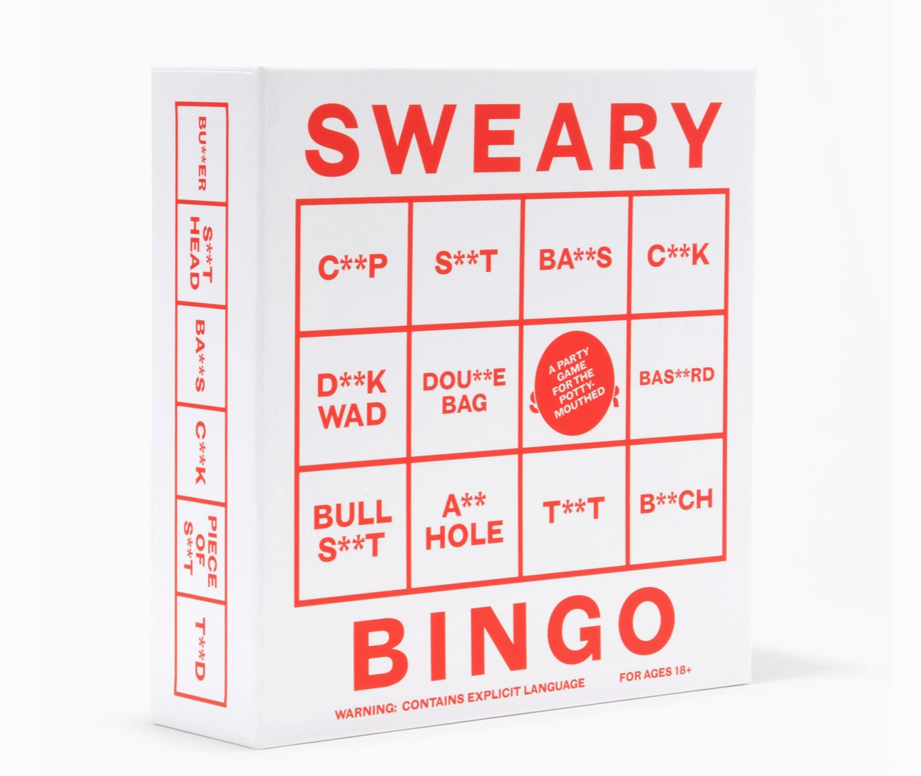 Jogue bingo com 64 palavrões coloridos e altamente ofensivos! Cada jogador recebe um cartão de jogo com 16 palavrões aleatórios: o primeiro a completar o seu cartão pode gritar BINGO - ou algo muito pior...