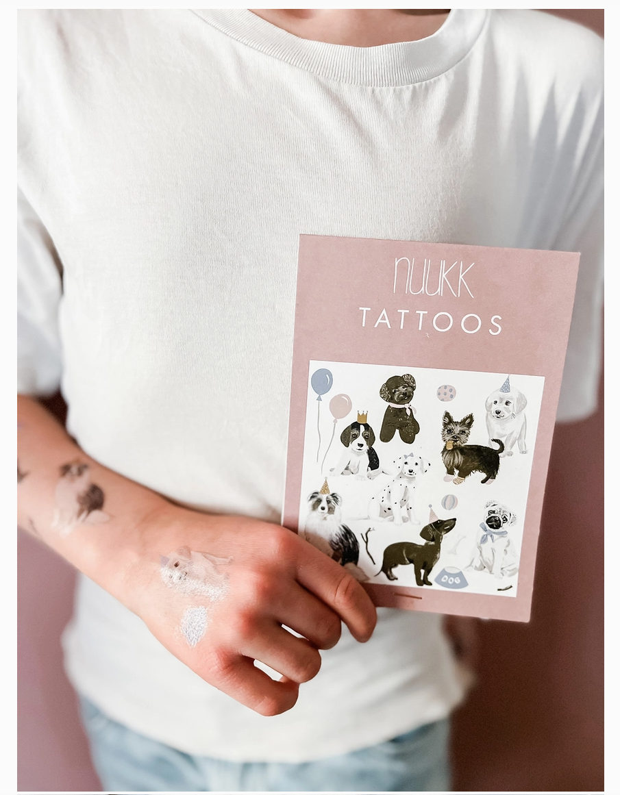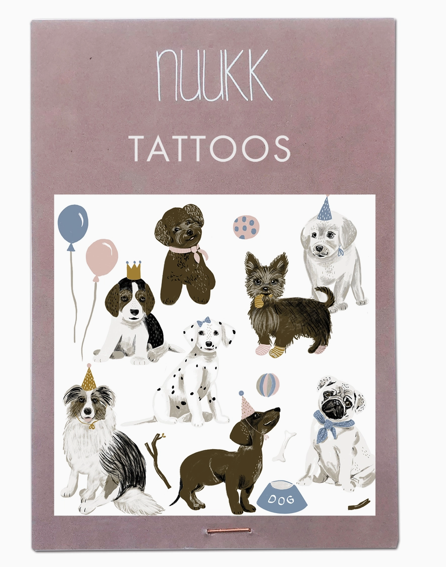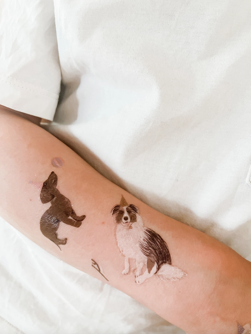 • Pacote de tatuagens temporárias com cães e acessórios em embalagem rosa