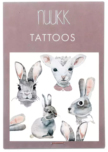 • Pacote roxo com tatuagens temporárias de coelhos e ovelha em aquarela