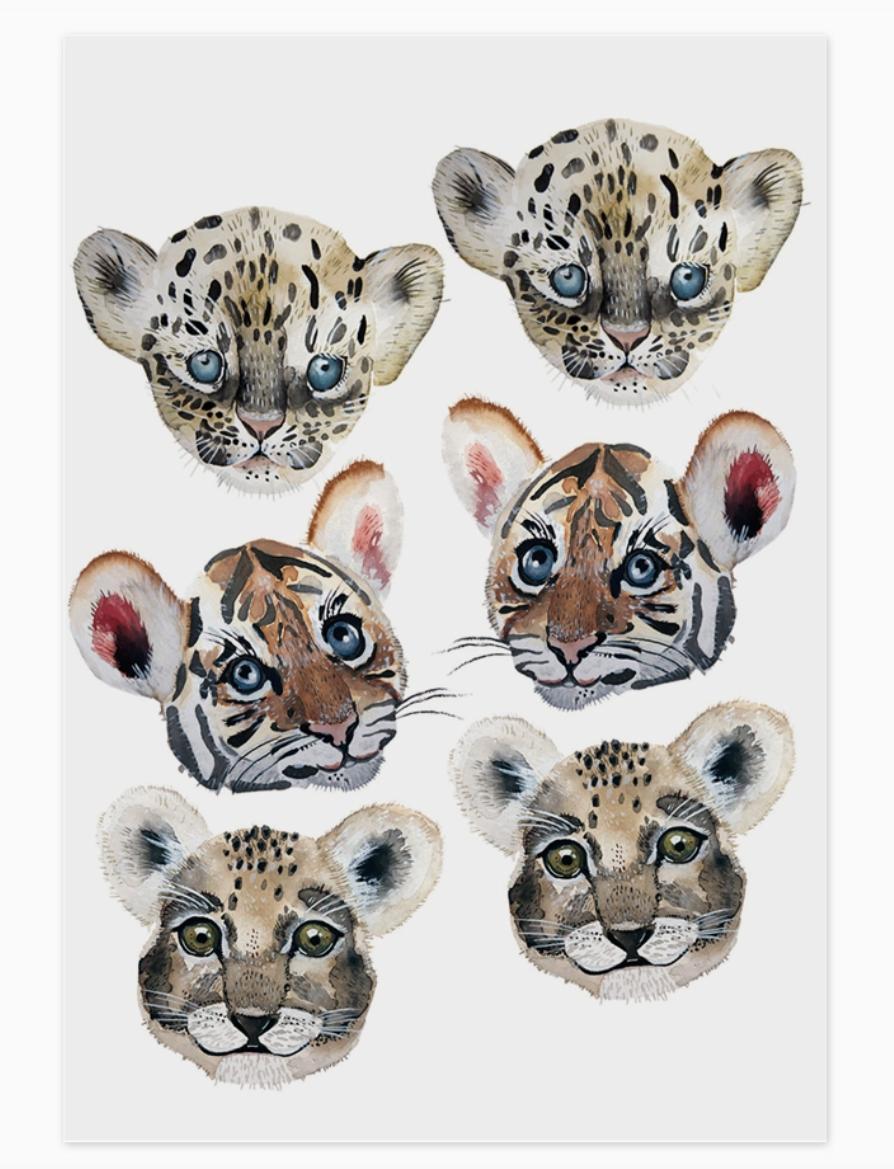 • Ilustrações realistas de cabeças de filhotes de leopardos e tigres sobre fundo branco