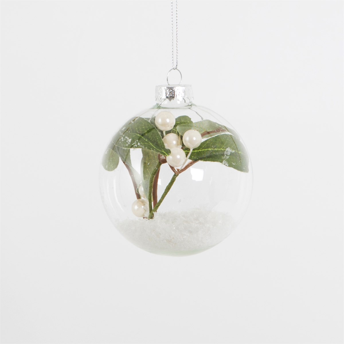 • Bola de Natal transparente com enfeite interno de folhas verdes e bagas brancas