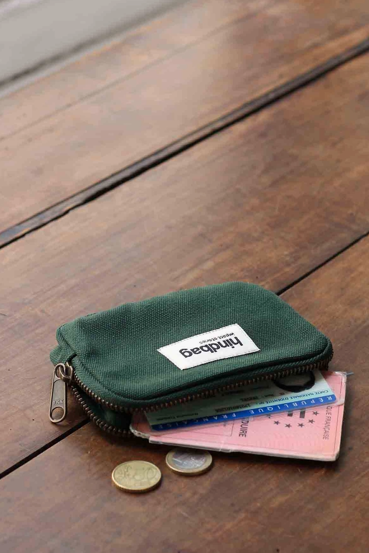 • Carteira verde pequena com fecho e etiqueta kindbag sobre mesa de madeira com moedas e chave
