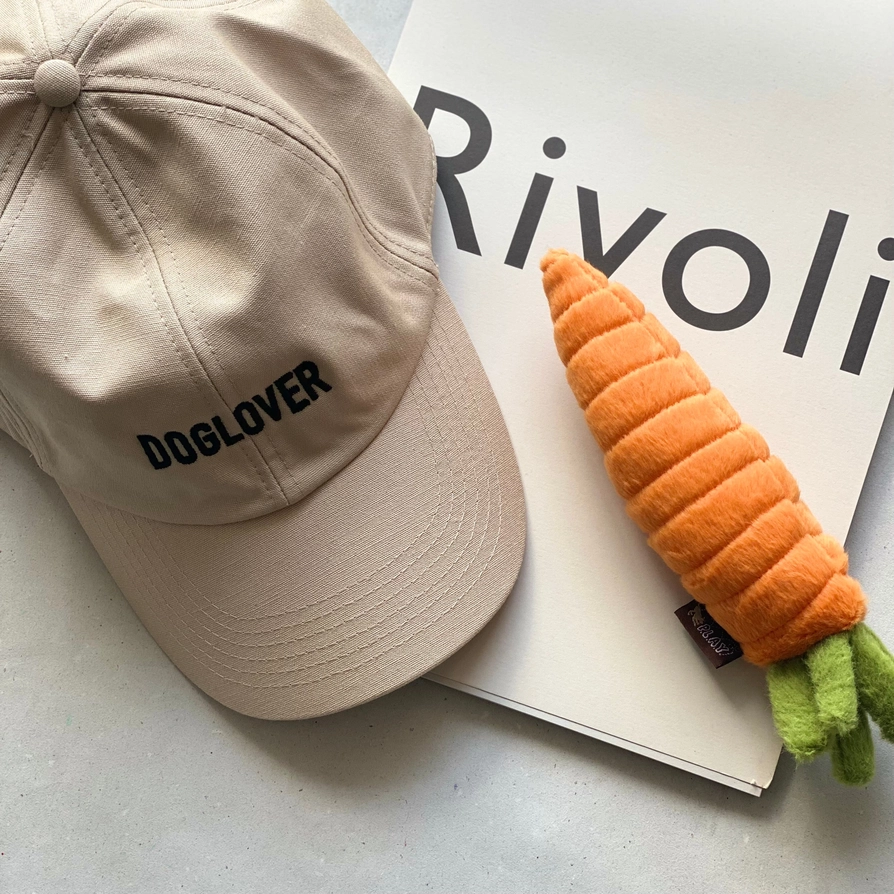 • Boné bege com texto 'DOGLOVER' e brinquedo de pelúcia em forma de cenoura sobre superfície clara