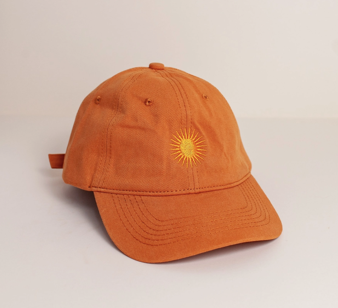 • Boné de tecido cor de ferrugem com bordado amarelo em forma de sol