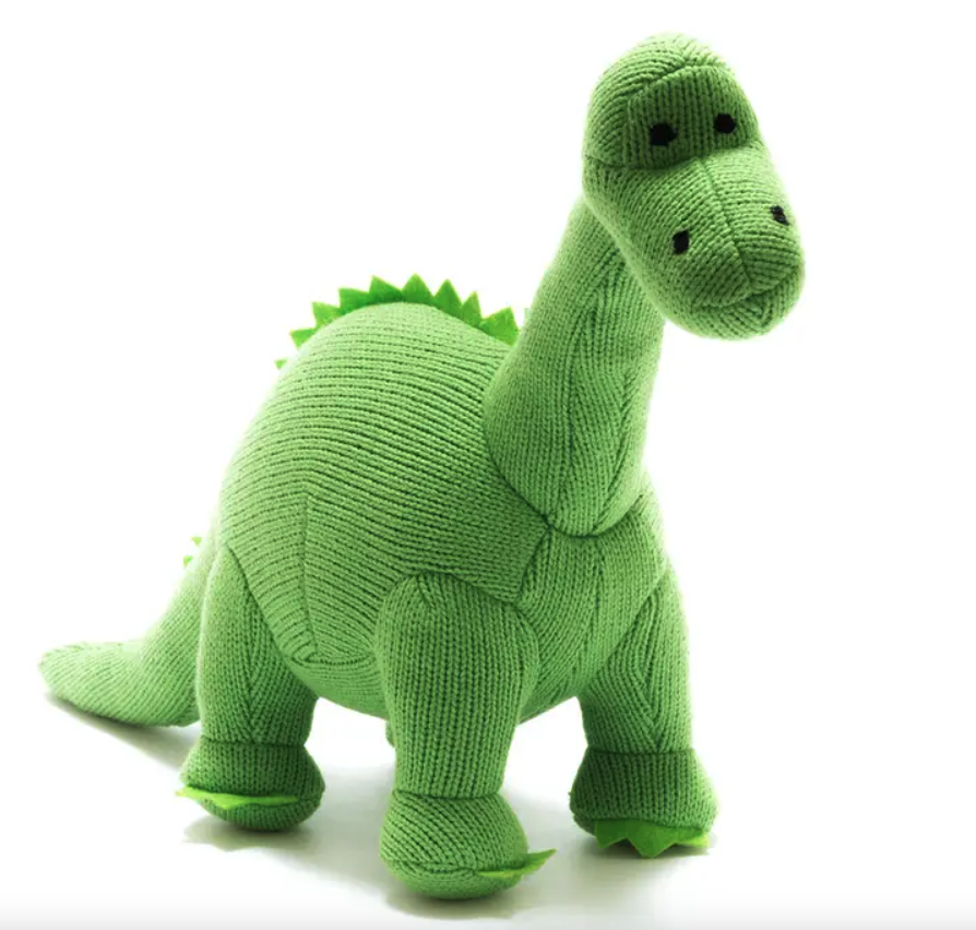 Este dinossauro tricotado tem um som calmante e é o tamanho perfeito para bebés e crianças.