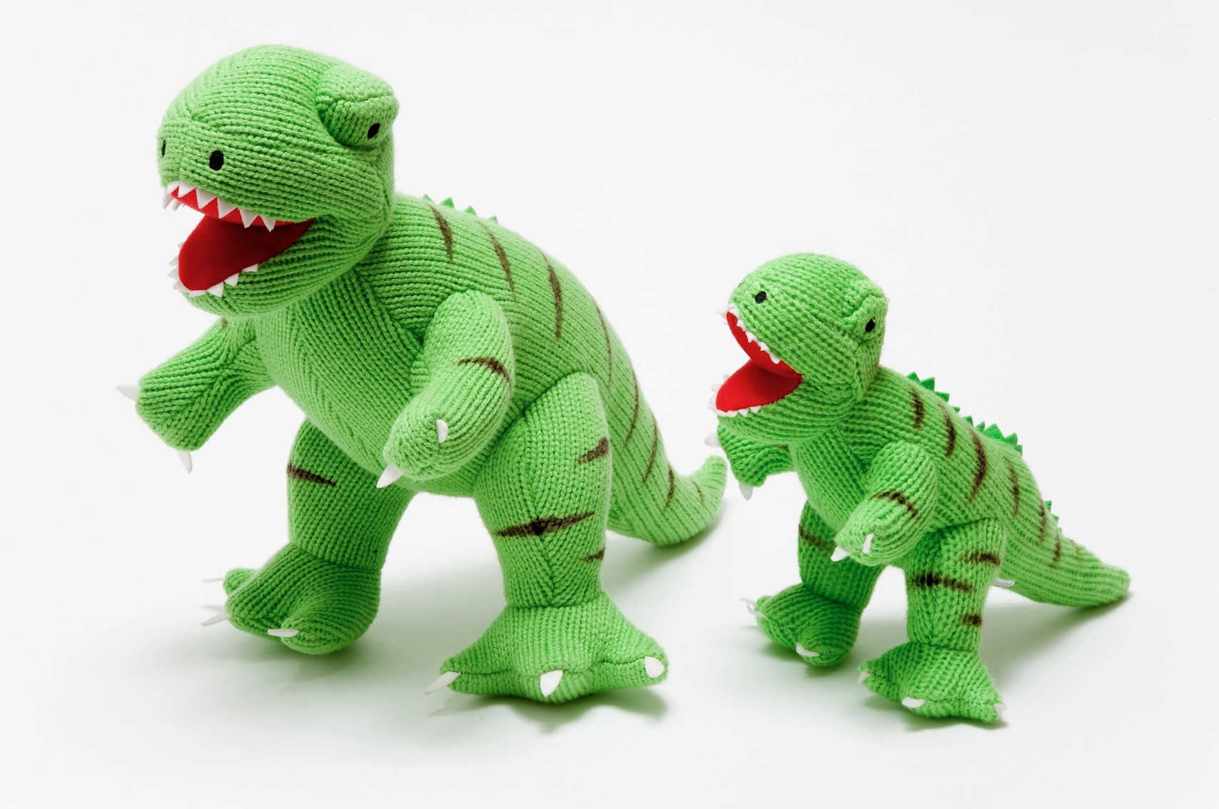 • Dois dinossauros de pelúcia tricotados verdes com boca vermelha em fundo branco