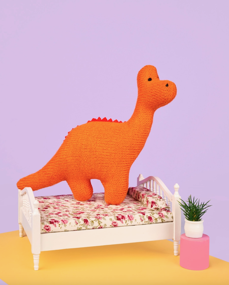 • Pelúcia de dinossauro laranja crochê numa cama branca floral com planta ao lado