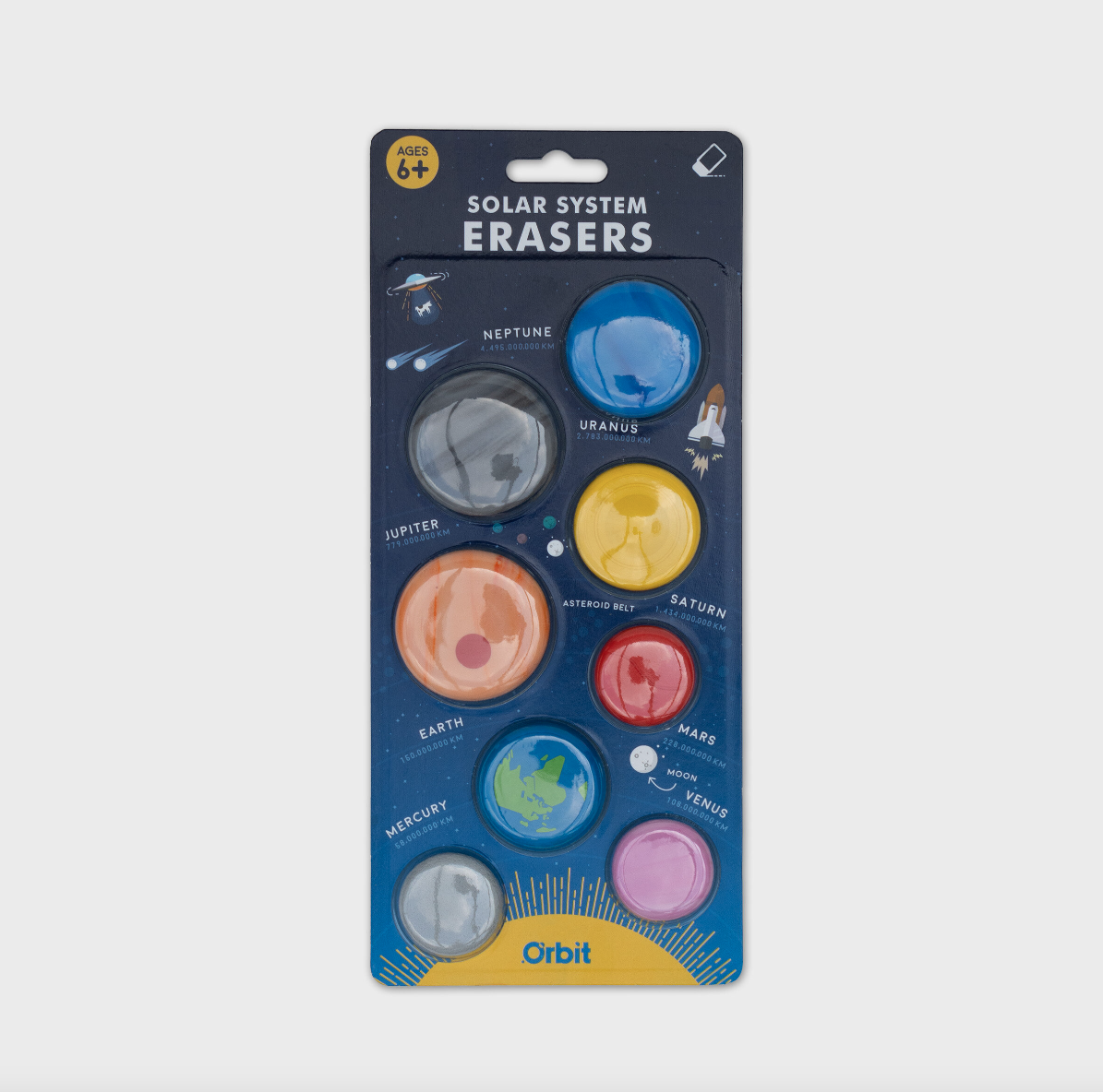 • Conjunto de borrachas coloridas em forma de planetas do sistema solar em embalagem azul