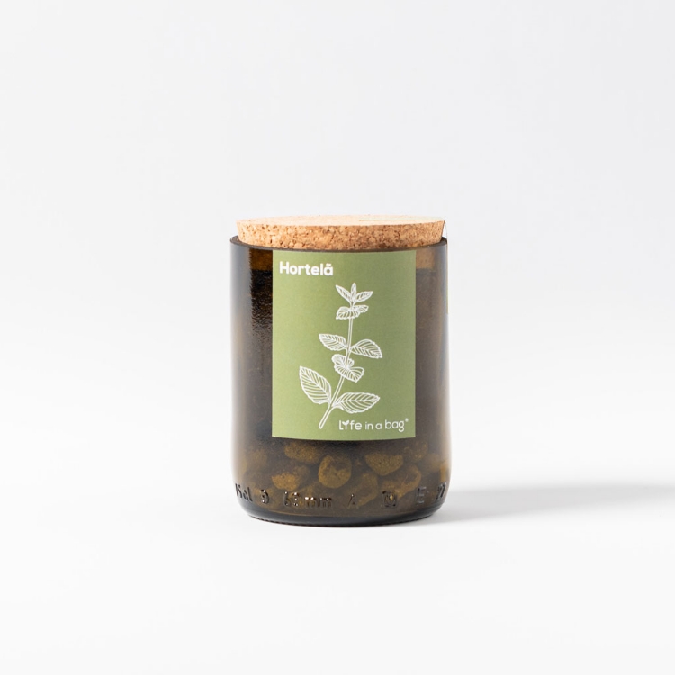 Conteúdo Uma garrafa de vidro cortada, tampa de cortiça, substrato orgânico, bolas de argila e sementes biológicas.