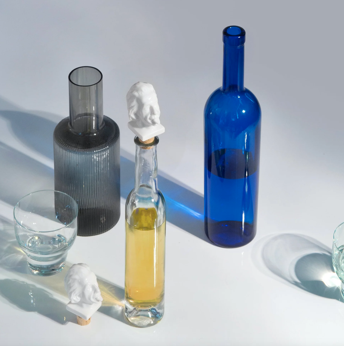 • garrafas de vidro transparentes e azul com copos e garrafa cinza texturizada sobre superfície branca