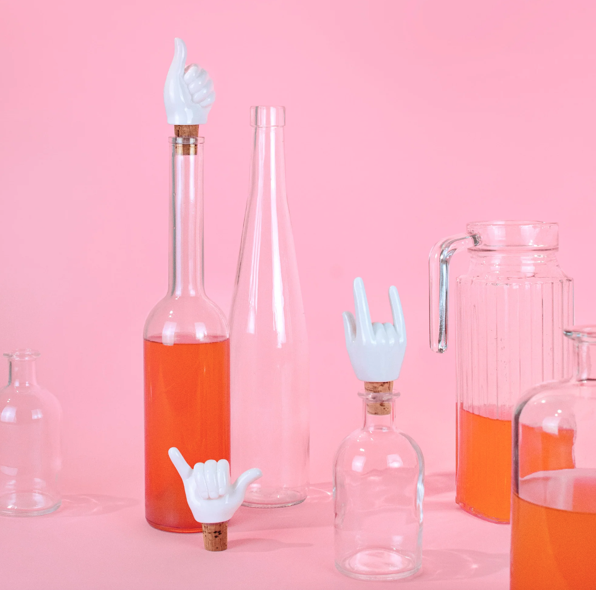 • Garrafas de vidro com líquido laranja e tampas com mãos brancas em gestos, fundo rosa