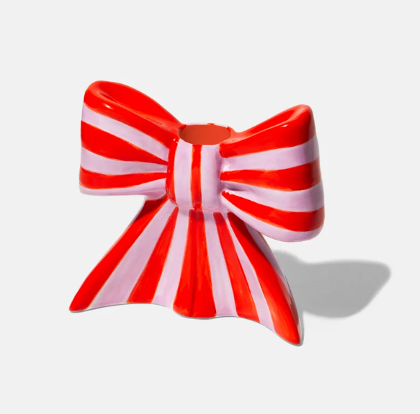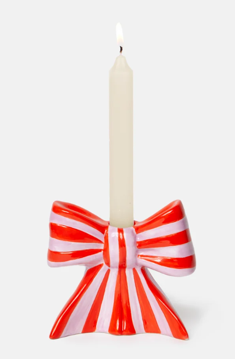 • Suporte de vela cerâmico em forma de laço riscado vermelho e rosa com vela branca acesa