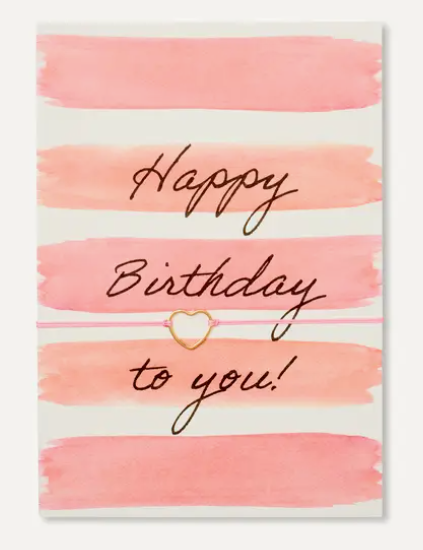 • Cartão de aniversário com texto Happy Birthday to you! em riscas rosas e pendente com forma de coração.