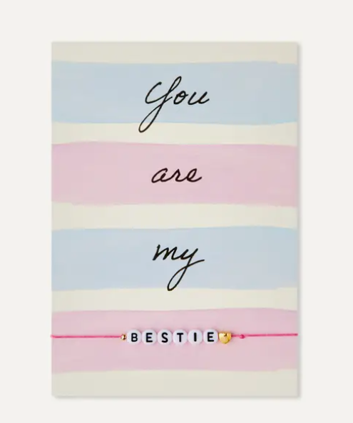 • Cartão colorido com texto e pulseira BESTIE.
