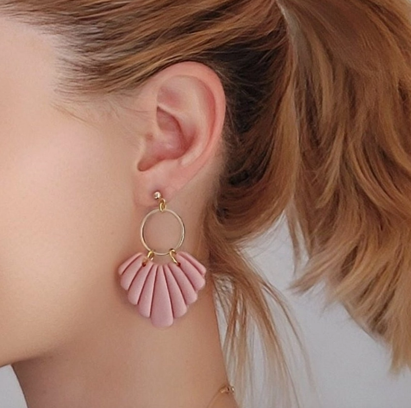 Brinco pendente dourado com peças rosa em formato leque num ouvido