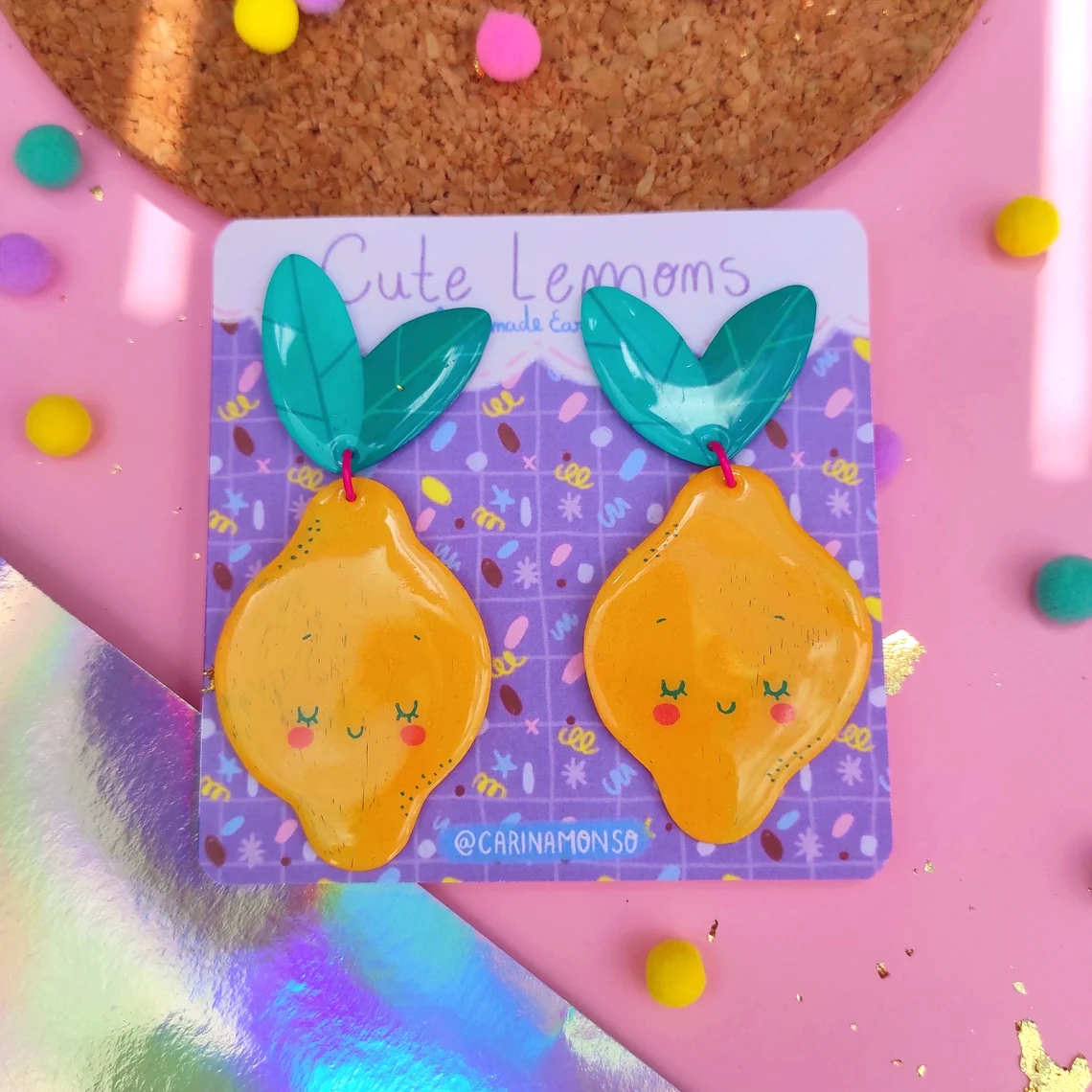 • Brincos amarelos em forma de limão com folhas verdes sobre cartão roxo decorado, em fundo rosa com confetes.