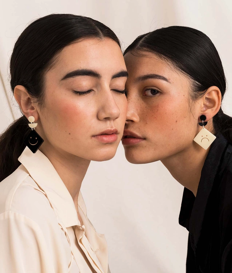• Brincos pendentes geométricos preto e bege com caras sorridente e triste
