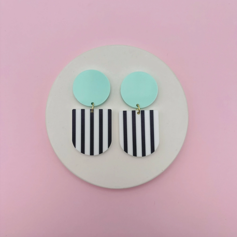 Brincos com padrões de riscas preto e branco na parte inferior e cor sólida na parte superior.