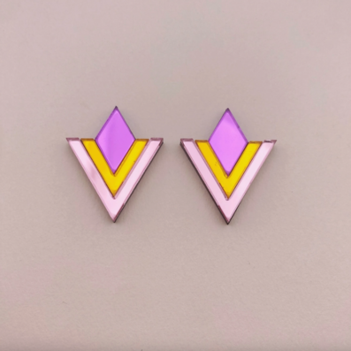 • Brincos triangulares com camadas lilás, amarelo e rosa