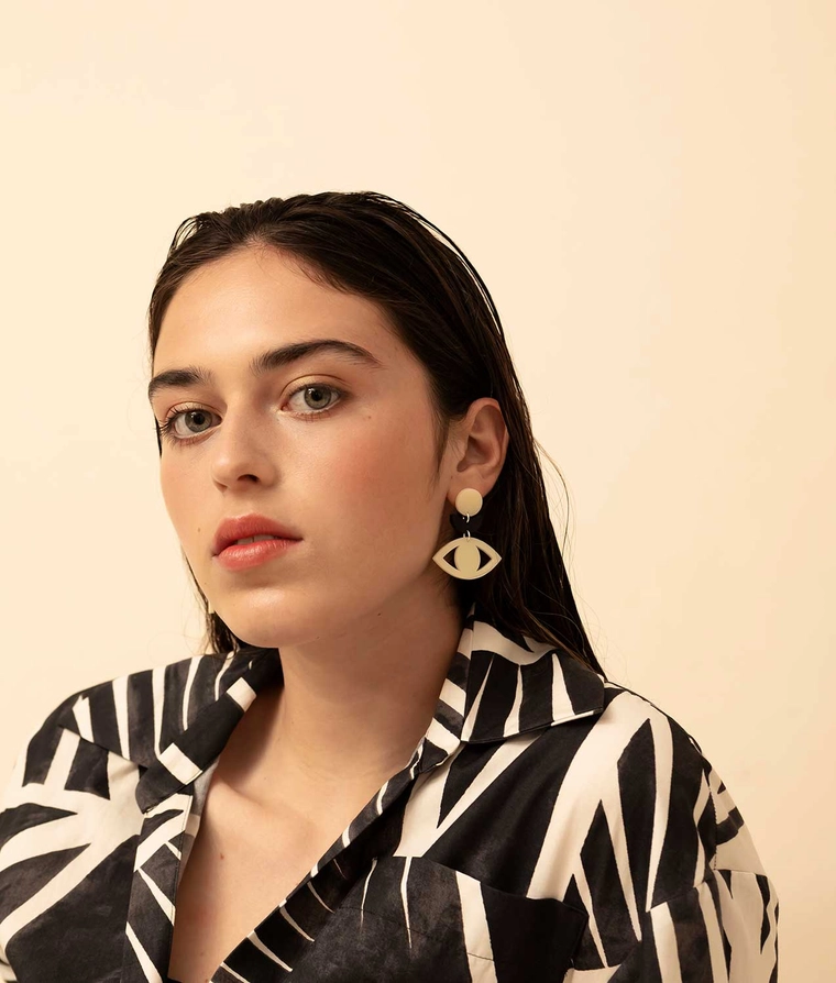 • Brincos dourados em forma de olho com mulher a usar camisa preta e branca