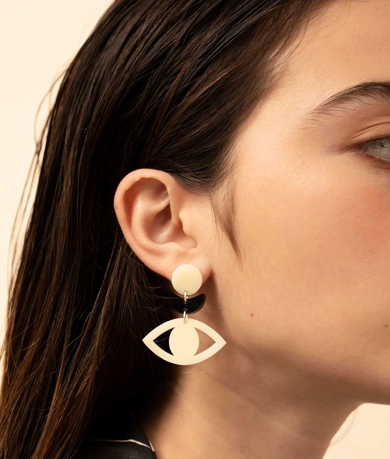 • Brincos pendentes creme em formato de olho numa mulher