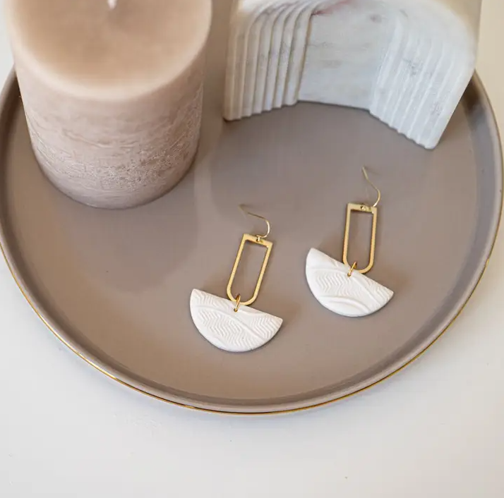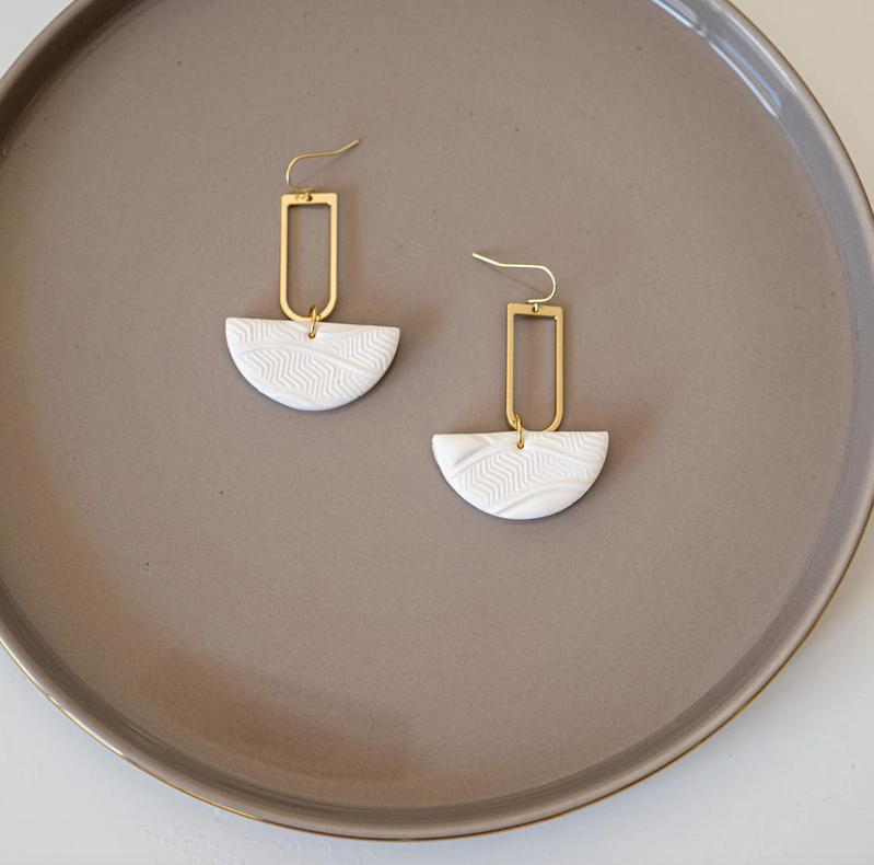 • Brincos dourados e brancos com padrão ondulado sobre base cinza