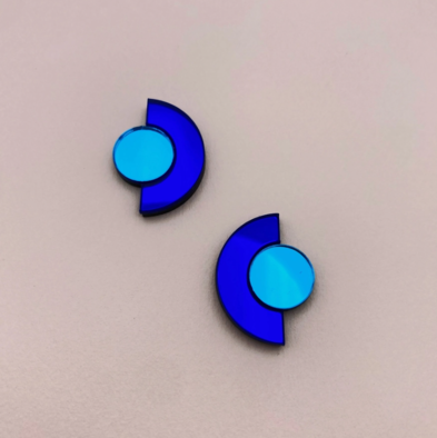 • Brincos azuis geométricos com círculo e meia-lua em fundo bege