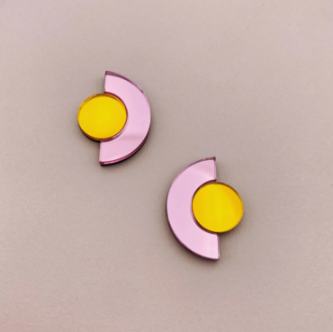 Brincos geométricos rosa e amarelo sobre fundo cinza claro