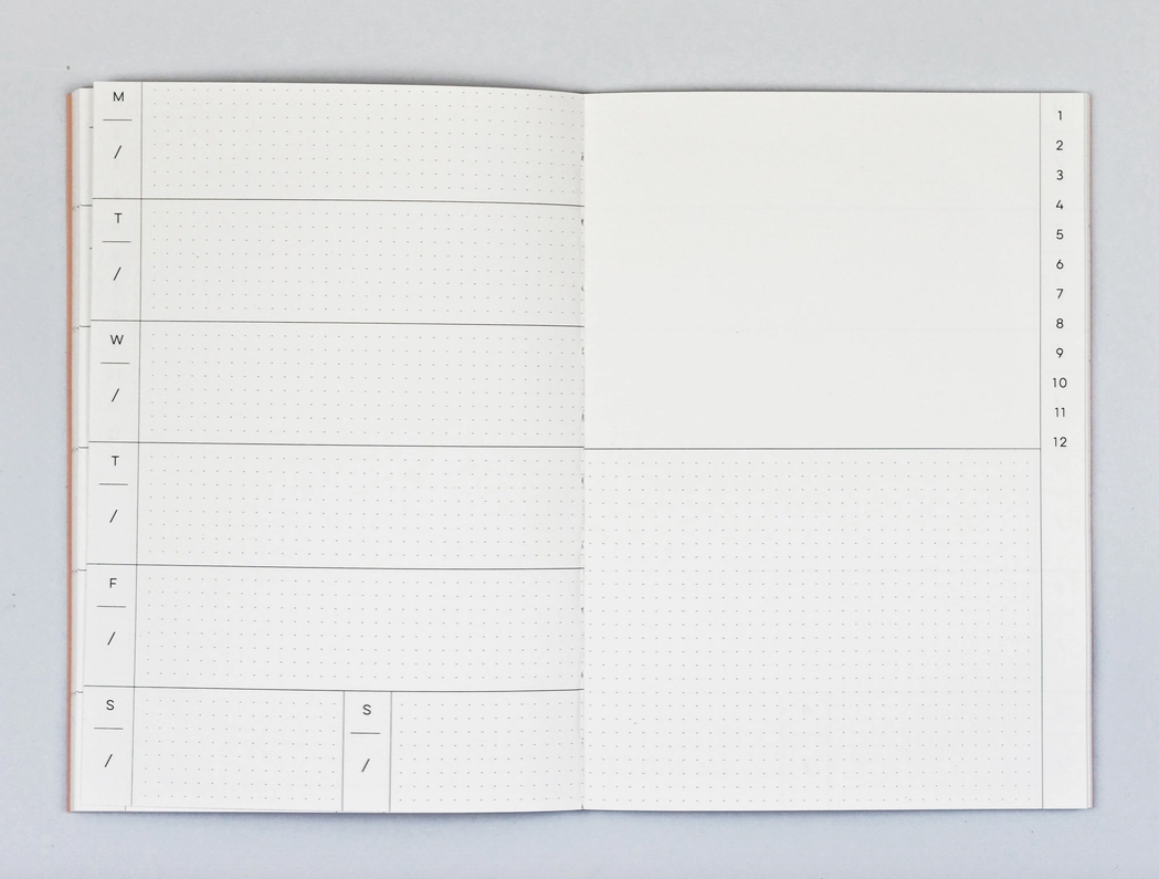 This is a 128-page pocket-sized undated layflat daily planner. It has a 2-page spread for each week—there are enough pages for 52 weeks/12 months in total. It also comes with a matching bookmark!