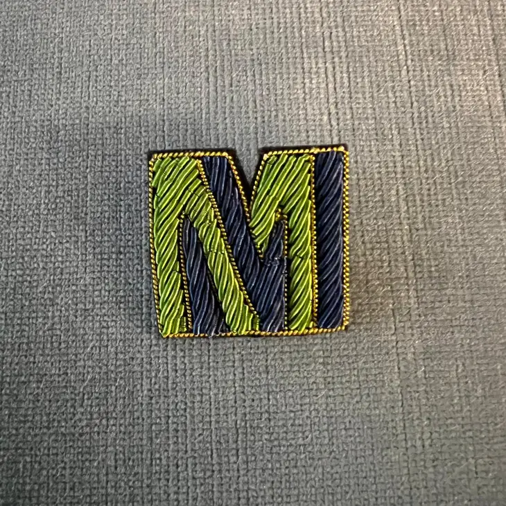• Patch bordado da letra M verde e preto com contorno amarelo sobre tecido cinzento