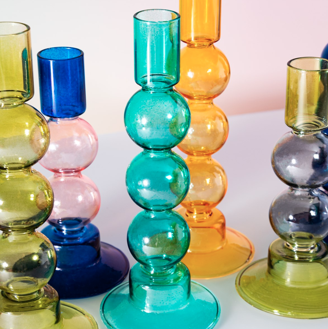 • Castiçais de vidro colorido com formas esféricas empilhadas