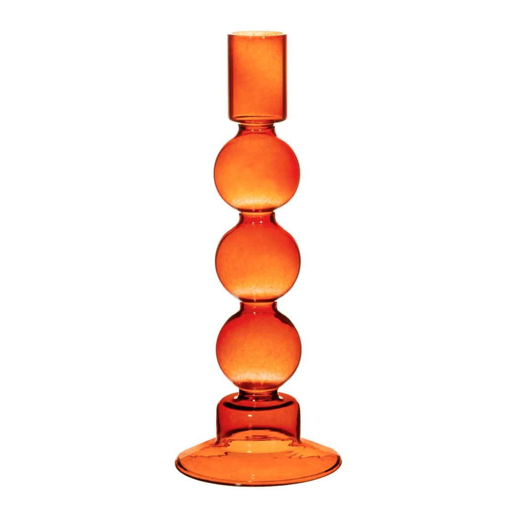 • Castiçal de vidro laranja com três esferas empilhadas e base redonda.
