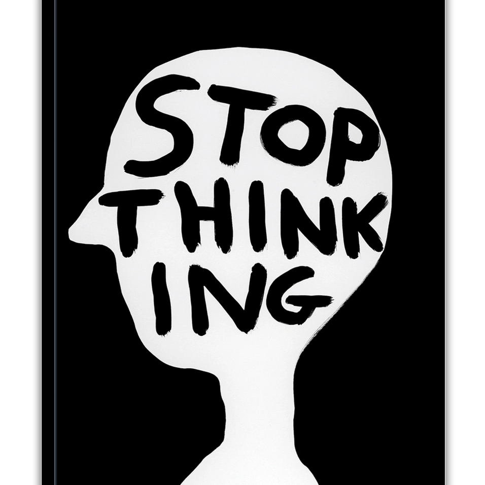 • Desenho em preto e branco de cabeça humana com texto STOP THINKING