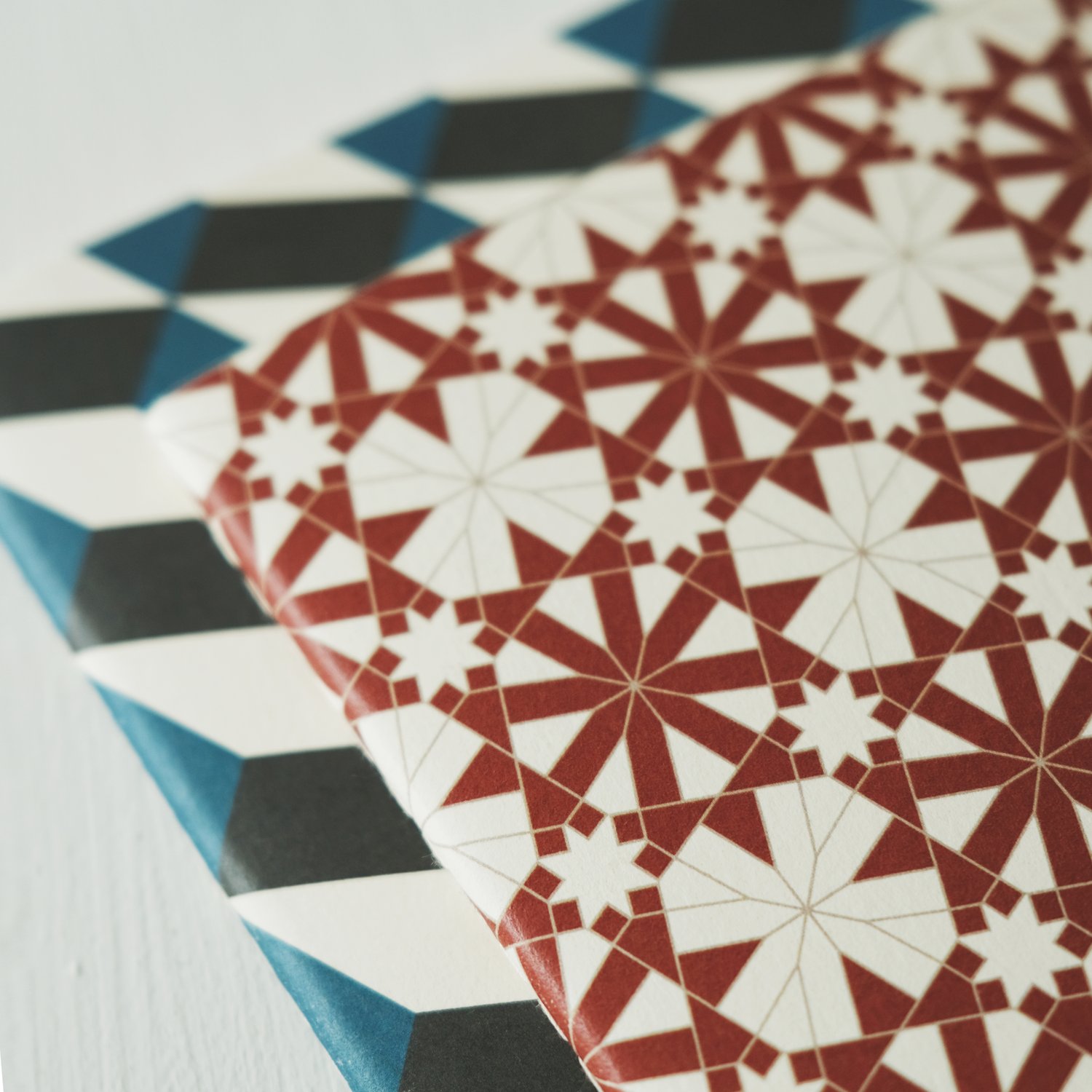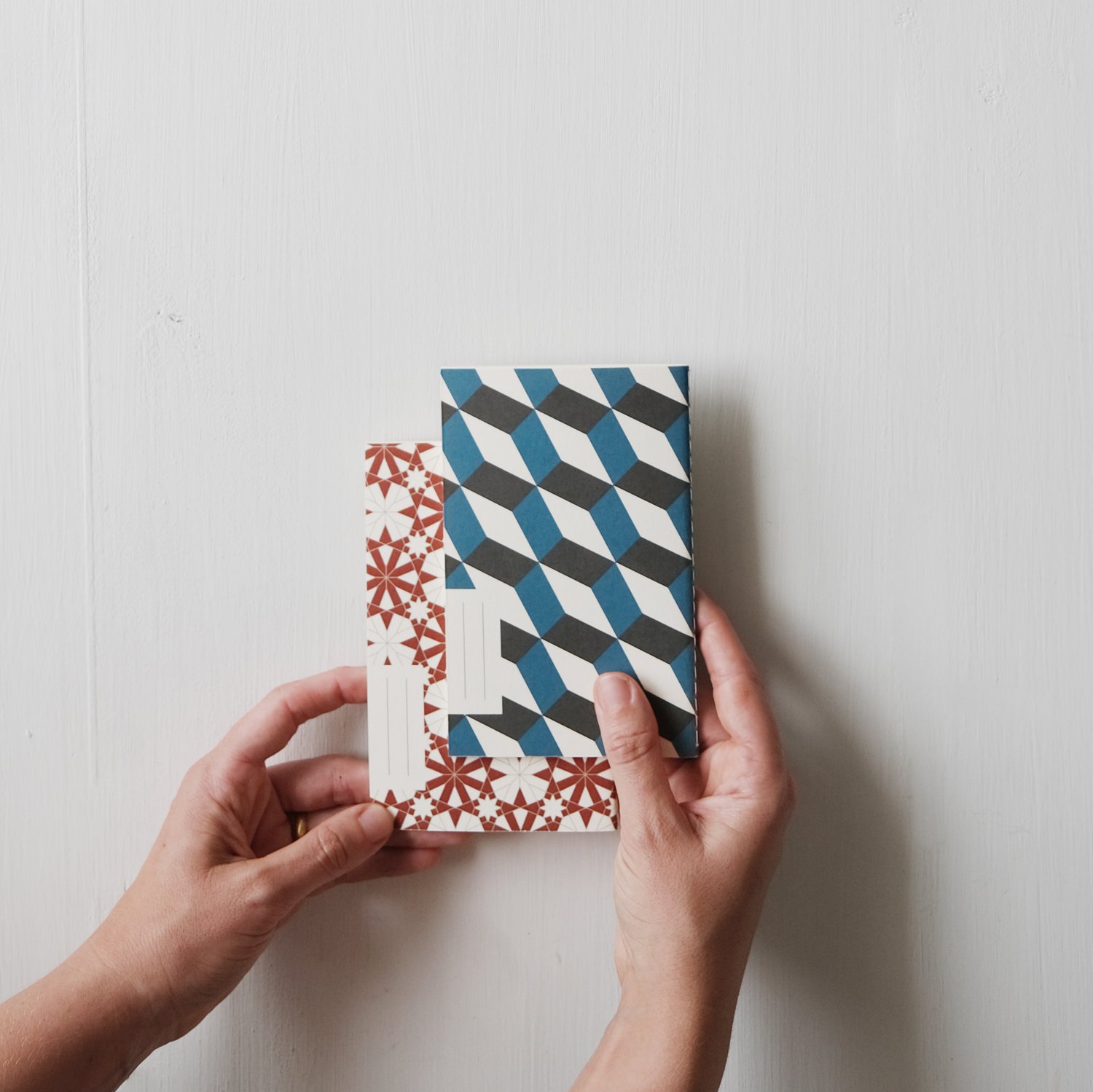 Cadernos de capa mole inspirados nos padrões dos mosaicos hidráulicos portugueses.