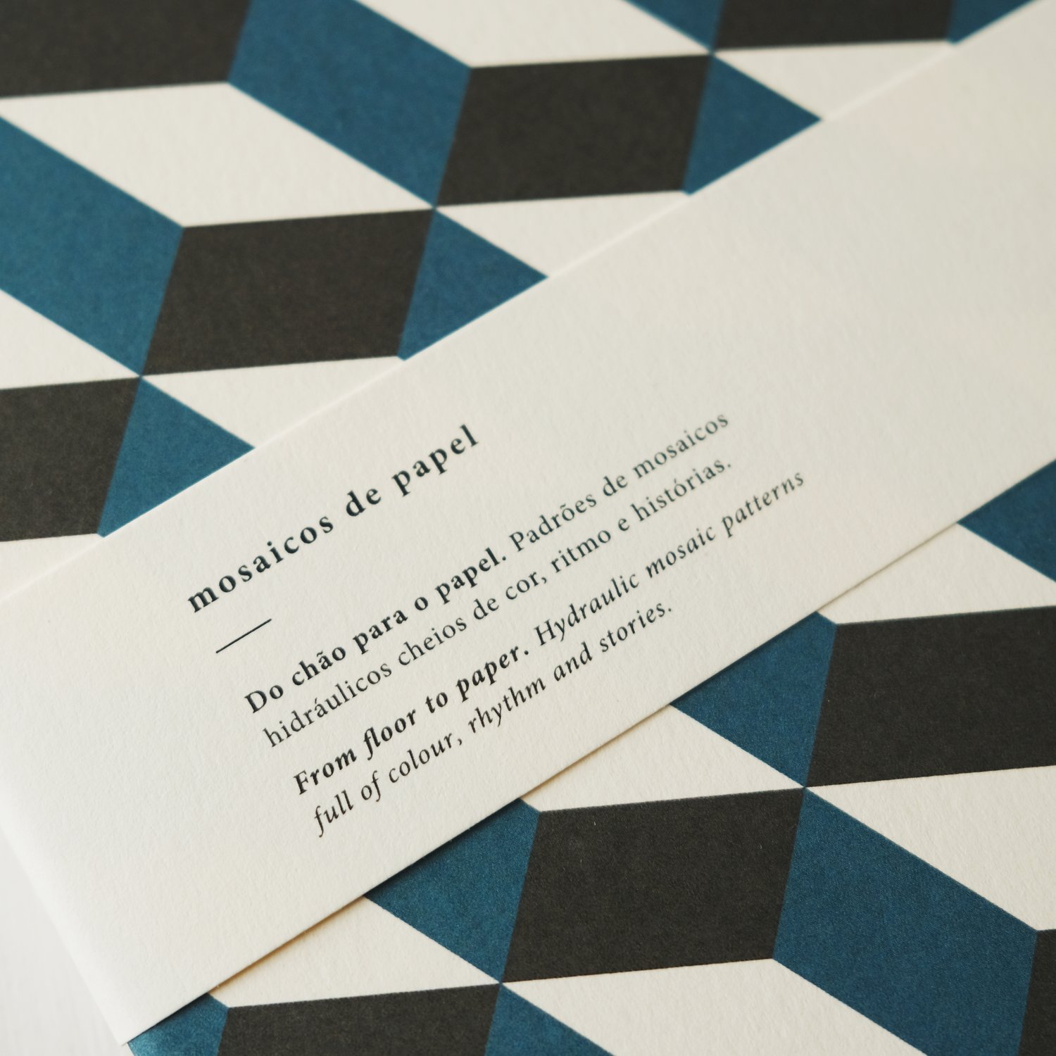 • Papel com padrão geométrico de mosaicos azul, preto e branco com etiqueta branca e texto em português e inglês