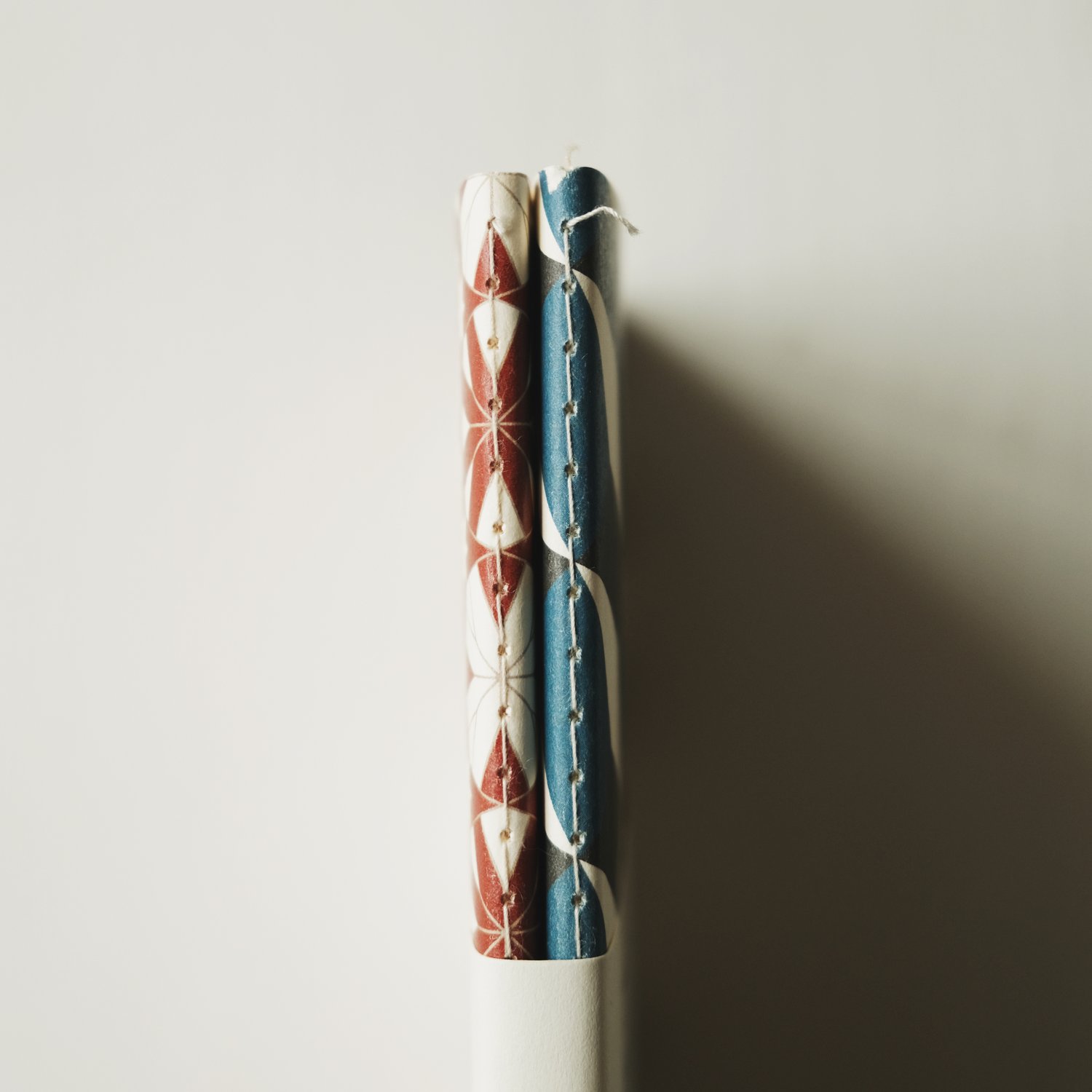 • Dois cadernos finos com capas de padrão geométrico vermelho e branco e azul e branco, encadernados com cordões claros, sobre fundo branco.