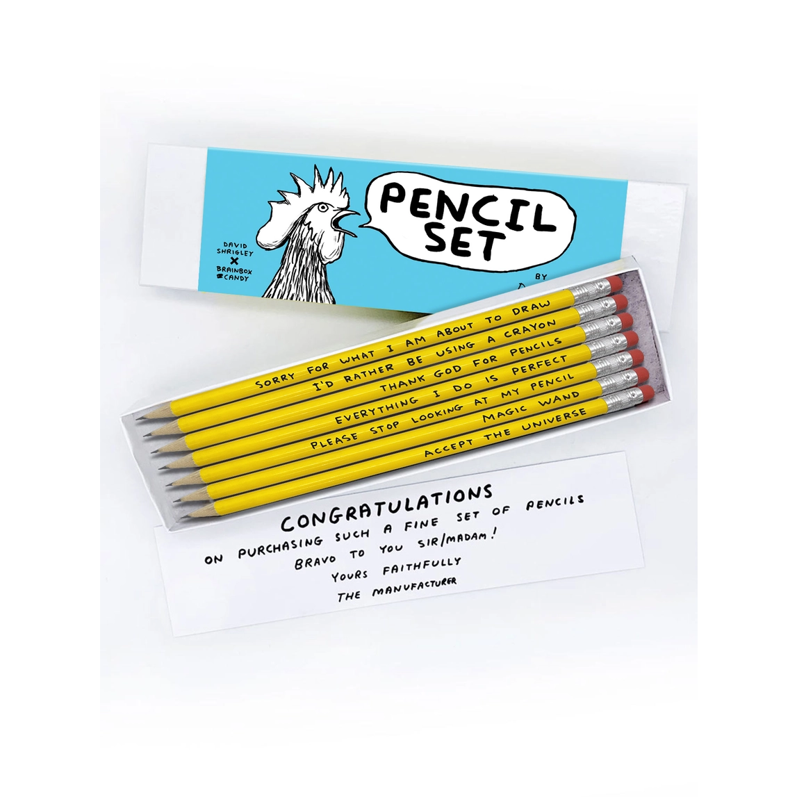 • Conjunto de lápis amarelos com frases impressas e embalagem branca com desenho de galinha